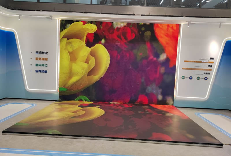 本案例中,維康國際為青島市某企業(yè)展廳提供一套L型LED顯示屏,如上圖所示,地面與墻面形成90度角,大屏幕顯示清晰,3D圖像顯示效果更好。