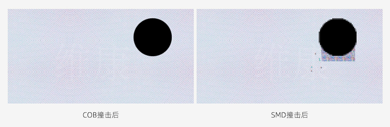 COB小間距顯示屏由于是直接把芯片封裝在了PCB基板上,在表面使用的環(huán)氧樹(shù)脂封裝,所以表面更加耐磨防撞,防塵防水,如下圖所示,在受到撞擊后,COB小間距顯示屏不會(huì)掉燈,而傳統(tǒng)的SMD表貼式LED屏則非常容易掉燈。