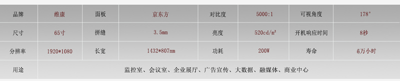 京東方65寸液晶拼接屏長寬尺寸為1432*807mm,基本參數(shù)如下: