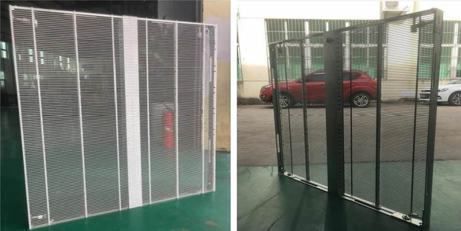 LED透明屏采用鏤空條狀設計,相對與傳統(tǒng)LED顯示屏箱體,其結構更加靈活,重星更輕。
