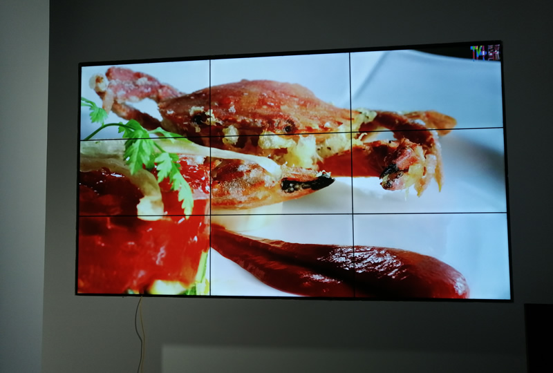 本案例中,維康國際為廣州天河某茶餐廳提供兩套顯示大屏,一套采用3x3拼接、55寸液晶拼接屏,安裝在會(huì)議室中;另一套采用4x5拼接、55寸液晶拼接屏,安裝在大廳中。這兩套大屏的屏體皆采用LG原裝面板,超窄邊設(shè)計(jì),雙邊拼縫僅有0.88mm,大屏幕拼接高清亮麗,一體化顯示效果很好,如上圖所示。