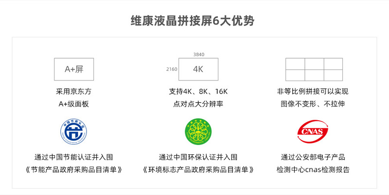 維康國際通過了ISO9001質(zhì)量管理體系、ISO14001、OHSAS18001、3C、節(jié)能認(rèn)證、環(huán)保認(rèn)證、公安部cnas檢測報告、抗震8級、防塵、CE、CB、FCC、ROHS、外觀專利、大屏軟件專利等,在支持客戶參與招投標(biāo)項目中有很大優(yōu)勢。
